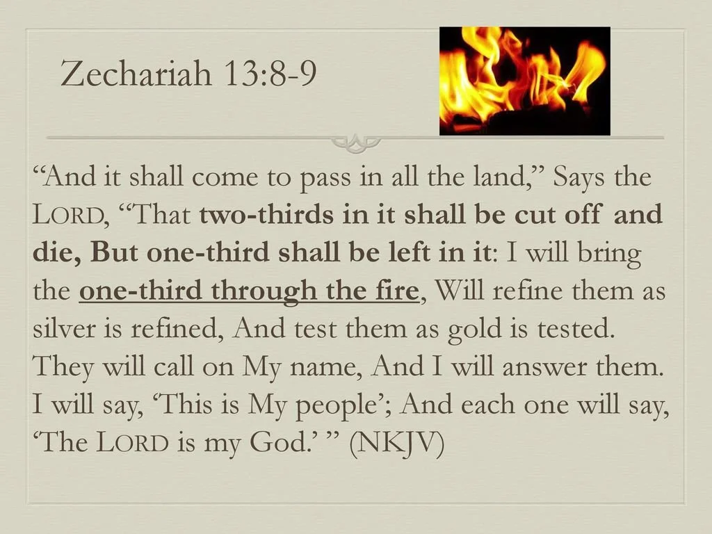“In the whole land,” declares the Lord, “two-thirds will be struck down and perish; yet one-third will be left in it. THIS THIRD I will bring into the fire. I will refine them like silver and test them like gold.”