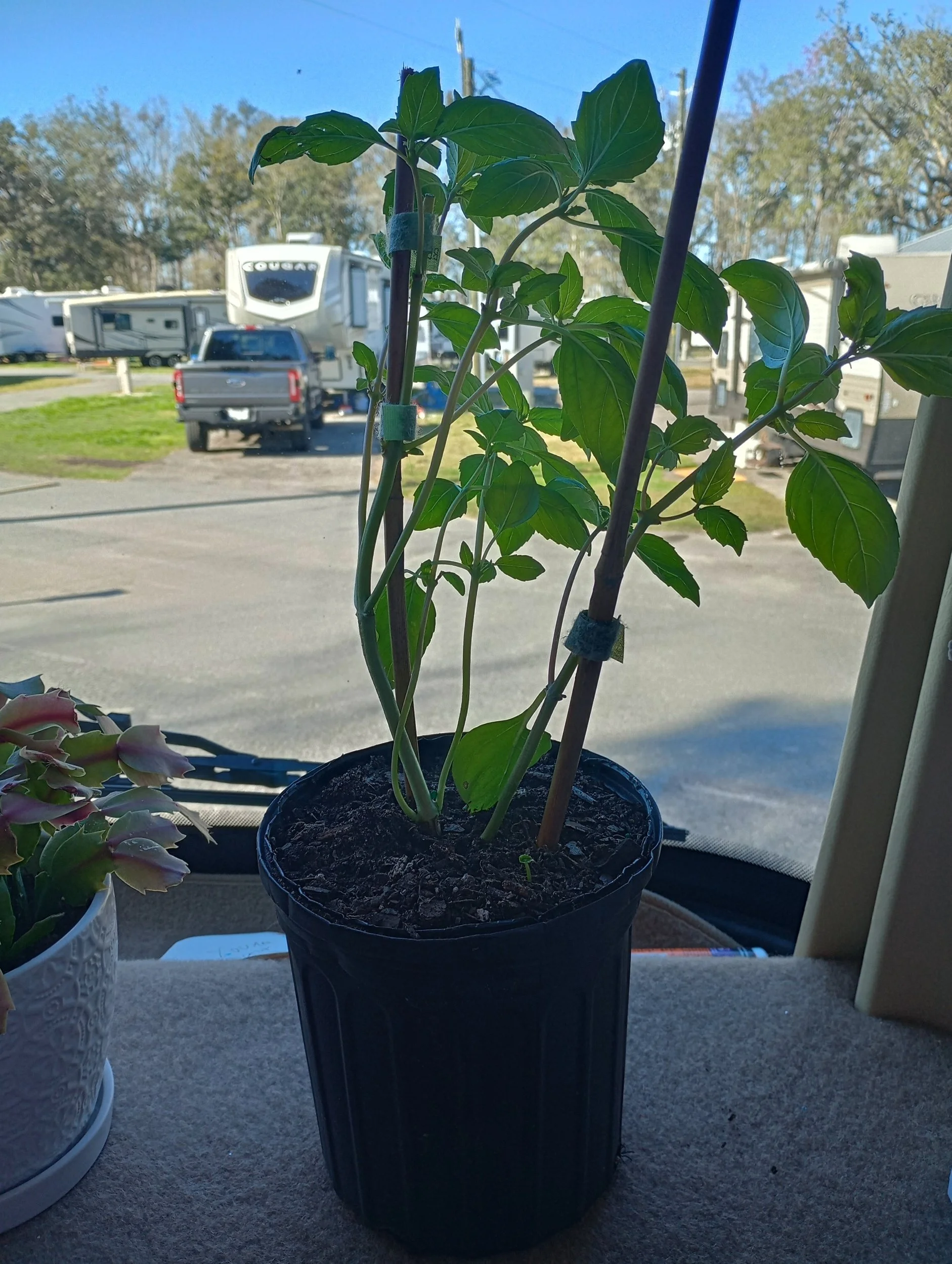 I have met some people in the RV Park but it has been slow going. Gary has spoken to a few folks while I am working. I’m getting there. I find that food has been a good draw. I have the young men across the street. Austin will chat with me almost daily. Today I took a loaf of bread to the young couple next to the construction guys. She was so sweet, in minutes she was back and asked me if I wanted a basil plant. She grows plants inside and outsider her RV and she has a basil growing like crazy. My basil on the dashboard is stunted.